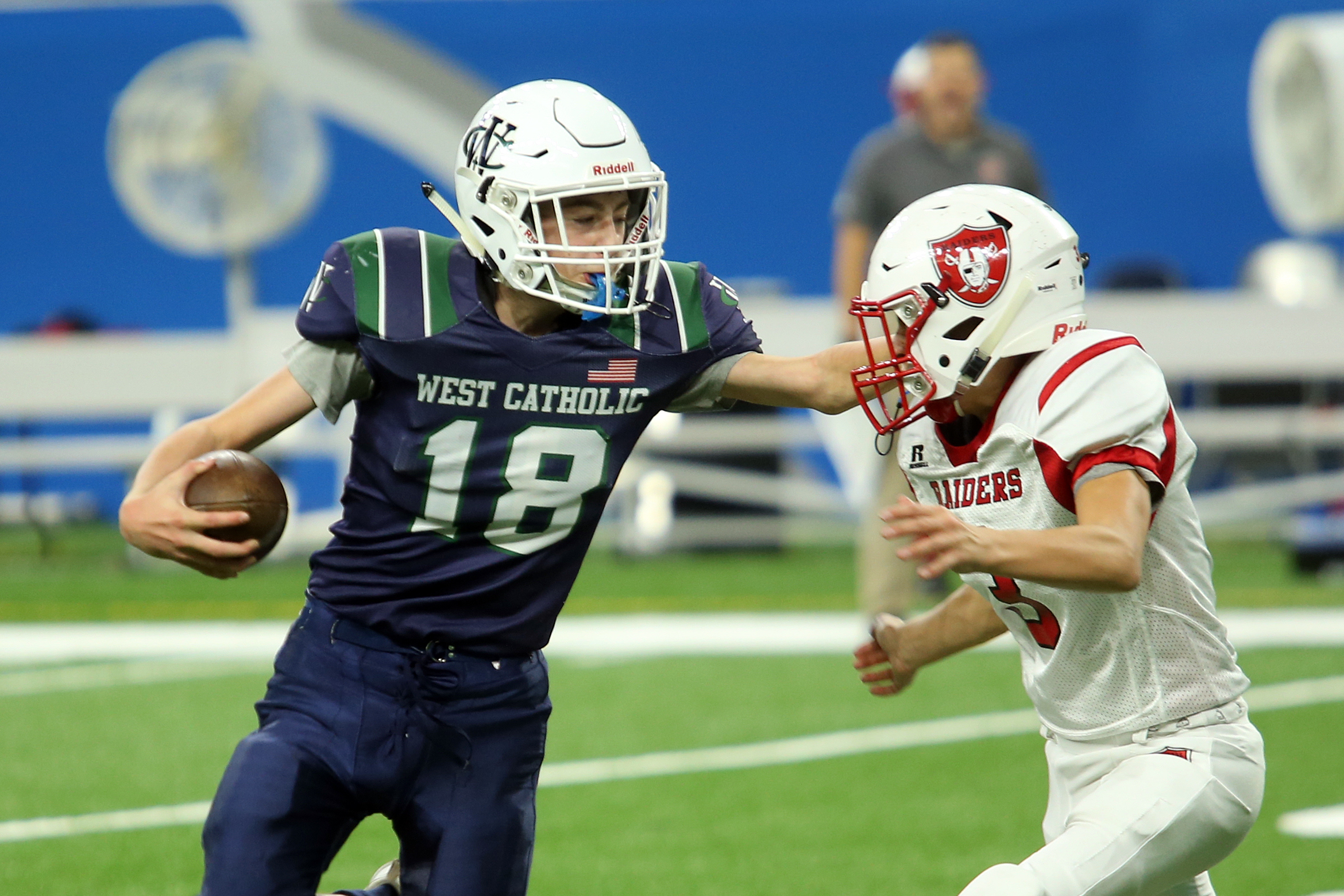 On fourth down and less than a yard at West Catholic’s 24, Winowich’s effort to go up the middle for a drive-saving first down was met by a mound of humanity. To the consternation of St. Regis fans, officials eyeballed the placement of the ball rather than bringing in the chains for a measurement and determined that the Raiders were inches short.