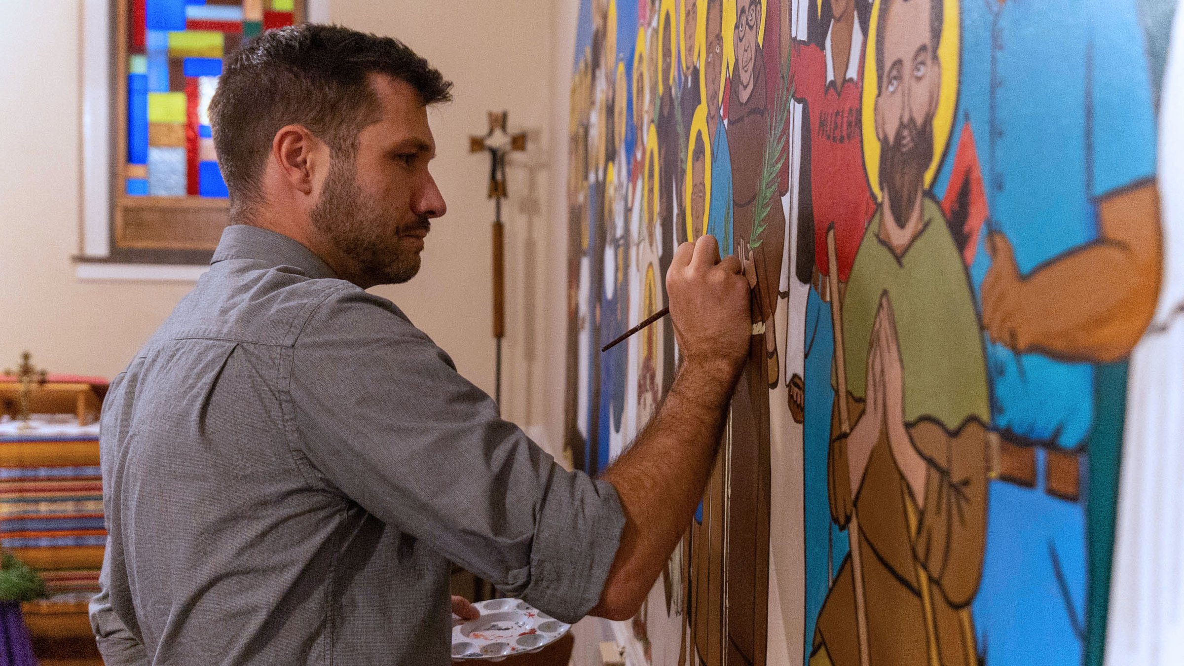 As Alexander painted in the chapel, students stopped by to pray during the school day or after classes ended. He found the process to be cathartic. Some nights when he was engrossed in the project, he would work until 10 p.m.