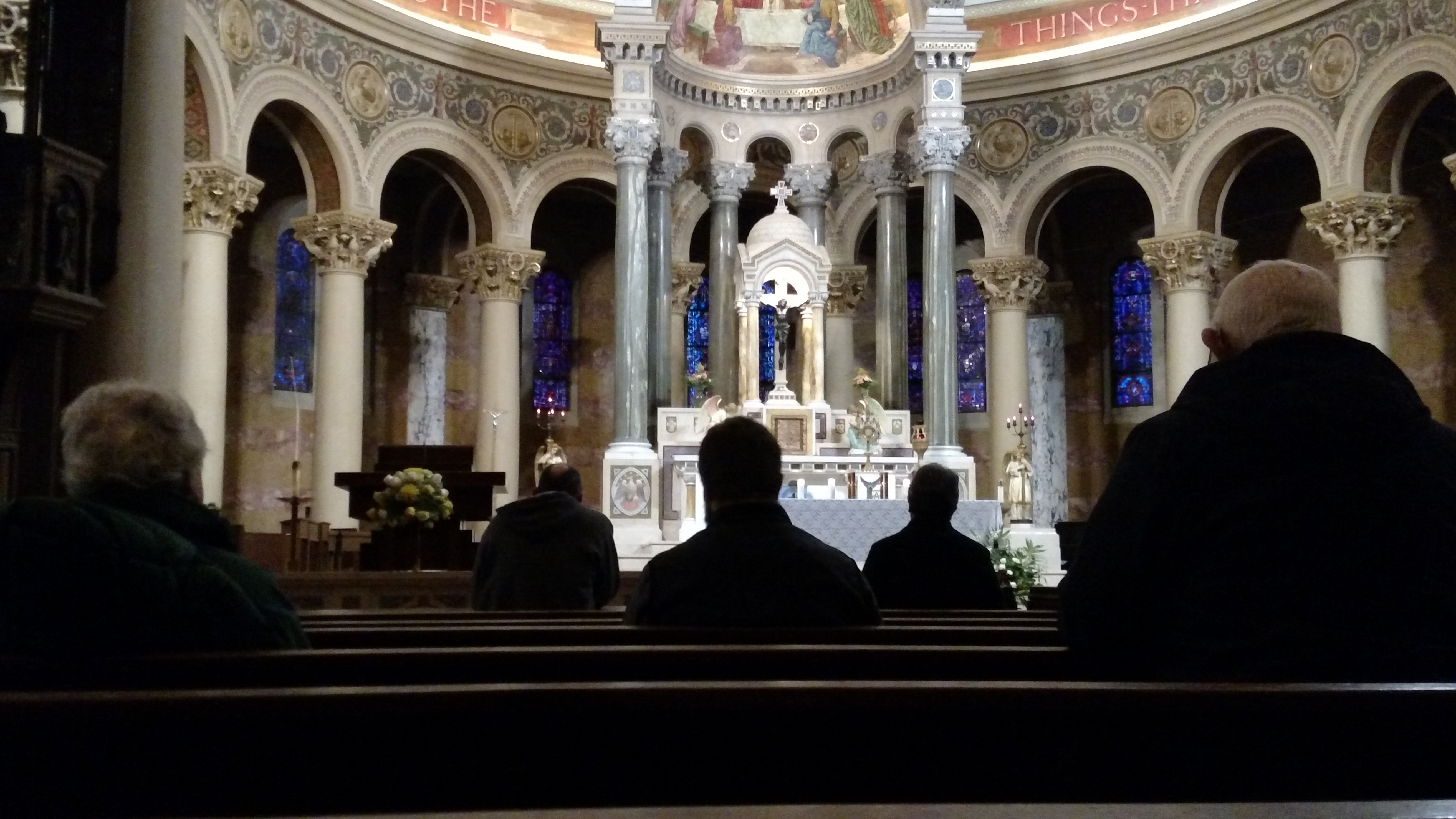 Because Holy Redeemer is such a large building (it was once believed to be largest Roman Catholic parish in North America, seating 1,400 people), the increased number of adorers is not readily noticeable. Typically, adorers are scattered throughout the nave of the Roman-basilica-styled church, which is darkened because of the early morning hour. The lighting is focused on the altar and the monstrance.