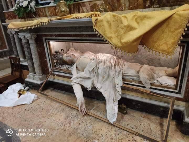 Although some images circulating online appeared to show the incorrupt body of St. Agatha herself damaged, most of St. Agatha’s remains are interred elsewhere, at the Badia di Sant'Agata in Catania, Italy. Shown in the images was actually a figure representing the Blessed Virgin Mary’s dormition, which was damaged.