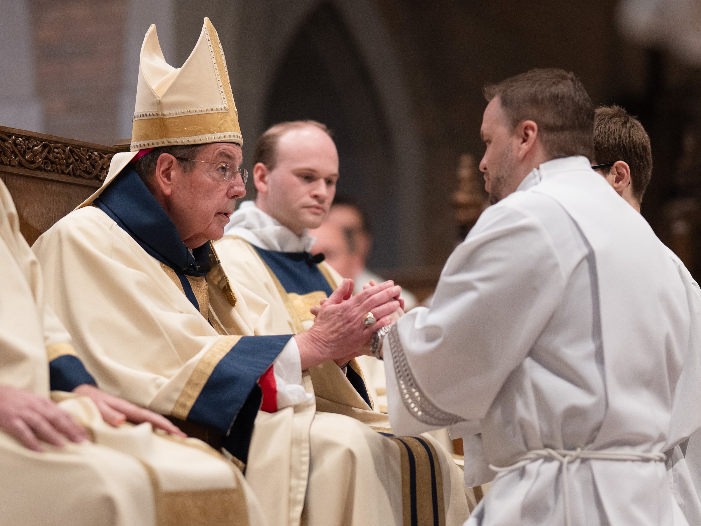 The candidates then, one by one, knelt before Archbishop Vigneron, who laid his hands upon them in the most solemn moment of the rite, praying the prayer of ordination and ordaining the men as deacons in the Catholic Church.