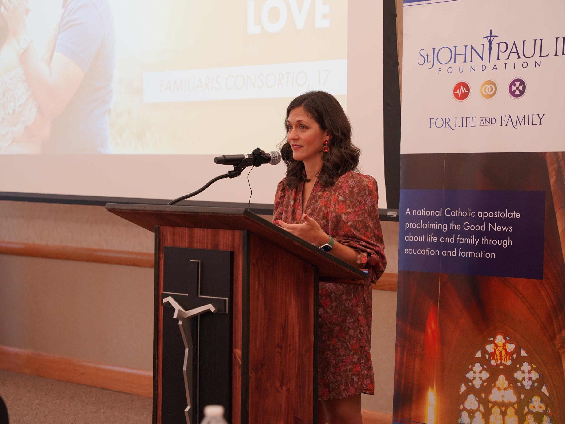 She encouraged couples to reframe their vision of marriage away from self-satisfaction toward self-gift, using St. Paul’s words in 1 Corinthians 13 as a spiritual mirror. Smyth asked participants to replace the word “love” with their own names — “Mallory is patient, Mallory is kind” — to reveal areas for growth.