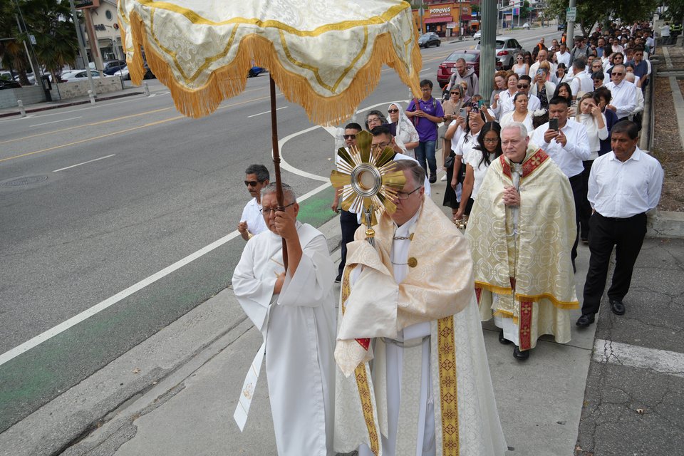 Fr. Dariusz Strzalkowski, the priest serving at Our Lady the Angels, extended his hands in blessing over the dogs, cats and people in attendance on a sunny fall day.