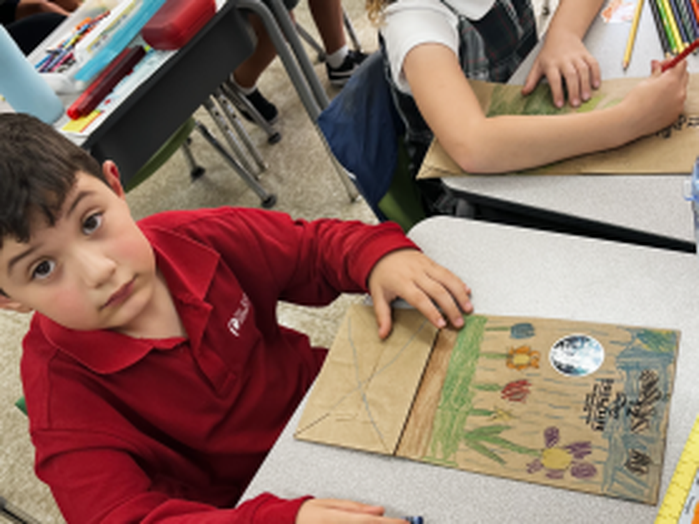 - First and second graders decorated paper bags for Another Day Resource Center for fourth grade to fill with lunches they made.