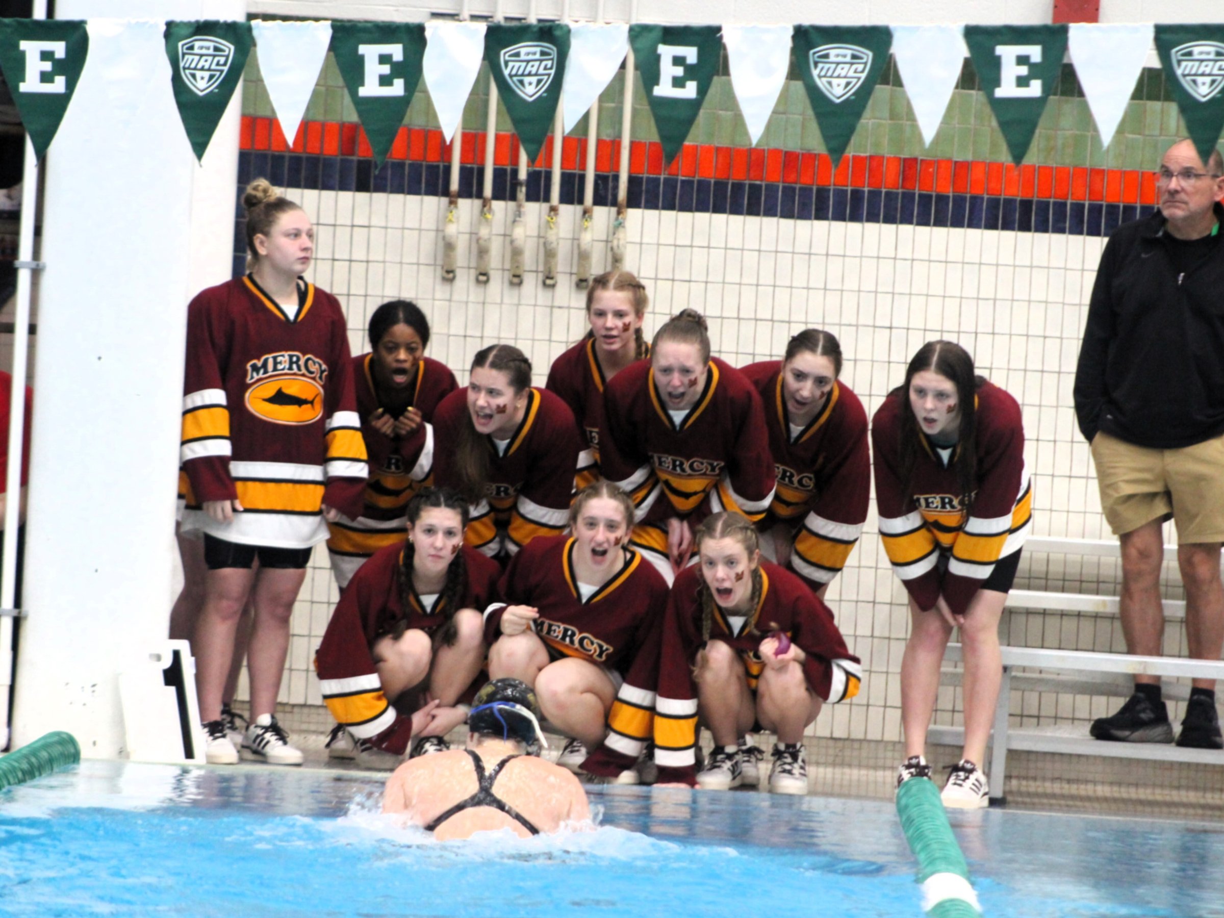Mercy entered the meet’s final event, the 400 freestyle relay, trailing top-ranked Grosse Pointe South by four points. But the Marlins’ Campbell Shore, Lyla Collins, Avery Tack and Ella Hafner won the race by one second over the Blue Devils, resulting in a 337-335 overall victory.
