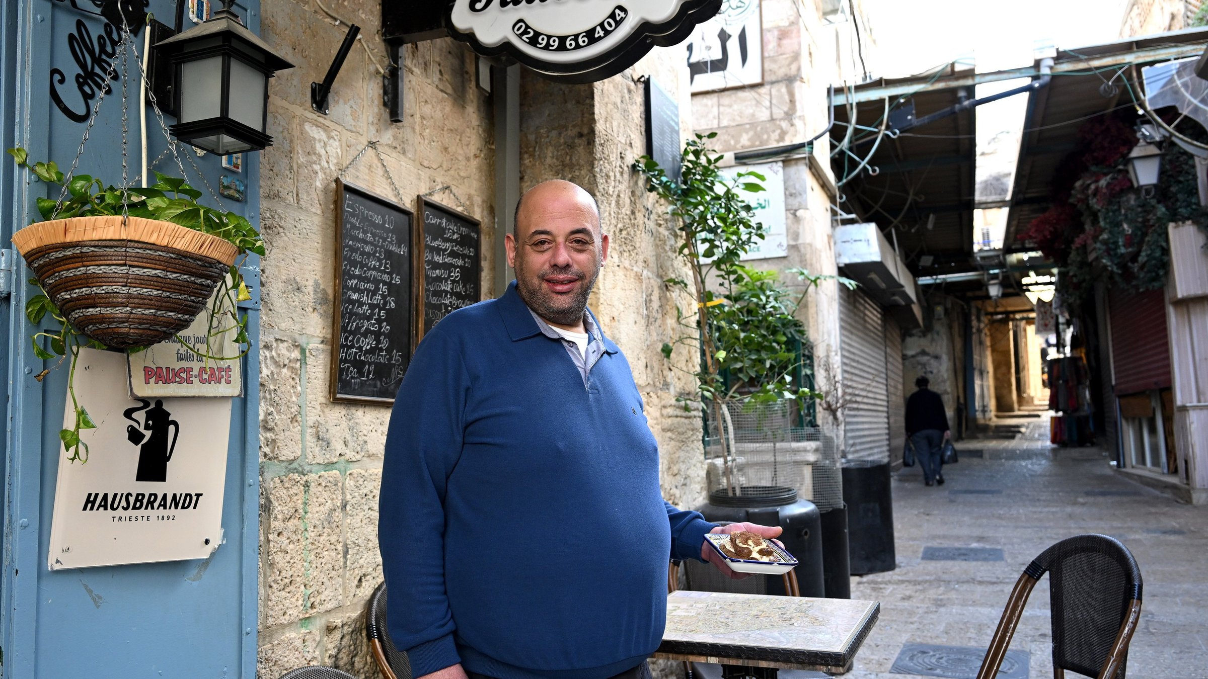 "When you get to the center, to the heart of the Old City, this is the traditional way we live as local people," he said, scooting up to one of the tables to chat with friends who have stopped by for a coffee. His pastry shop is for everyone, he said, Palestinians, Israelis, internationals -- and he is waiting for the internationals to return.