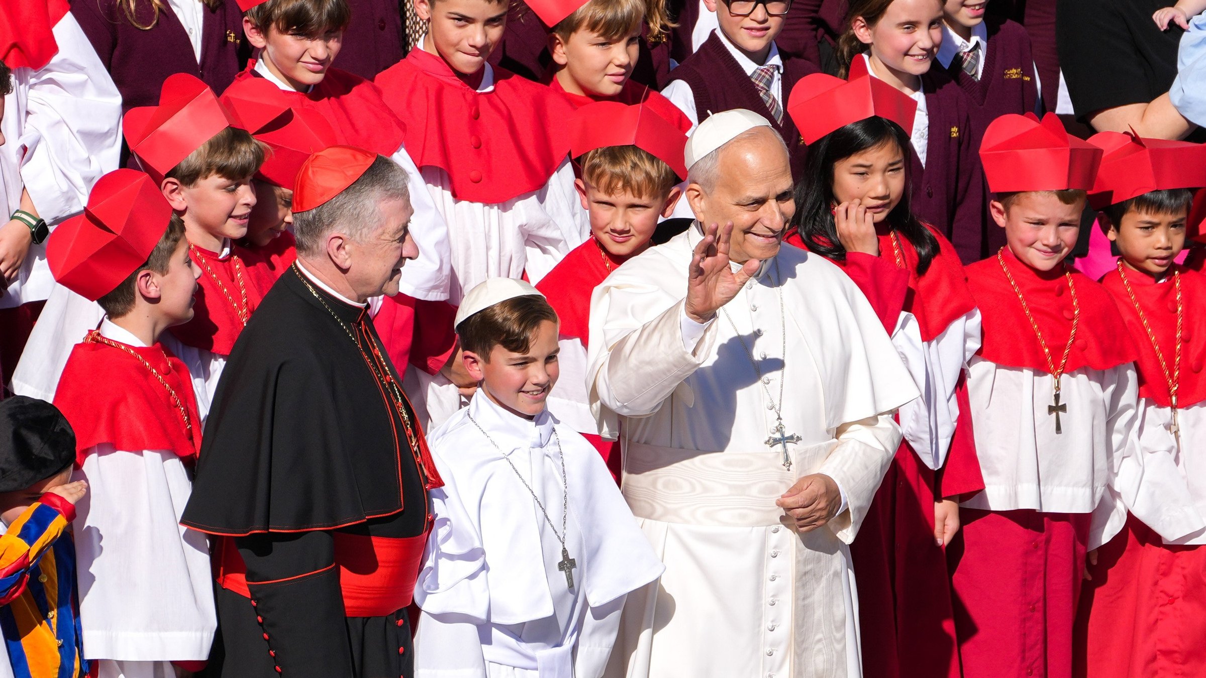 Among the more than 60,000 pilgrims in the square was a group of students from Our Lady of Mount Carmel Academy in Chicago with Cardinal Blase J. Cupich. The students were wearing white and scarlet outfits and a four-cornered hat similar to what a cardinal wears. One student was dressed as a Swiss guard.