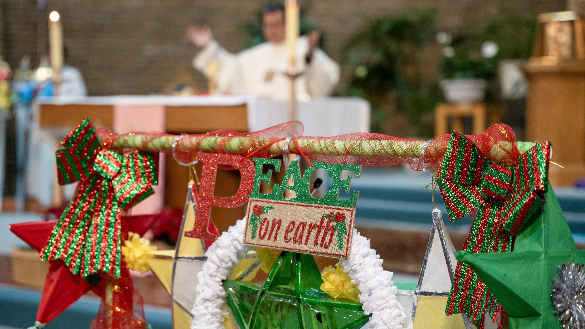 The music at St. Mary, Cause of Our Joy is in the national language, Tagalog, and the opening procession into the church includes a parade of “parols” or lanterns, which are then placed in front of a statue of the Blessed Virgin Mary. Every Mass is followed by Filipino food and fellowship, sponsored by different members of the community each evening.