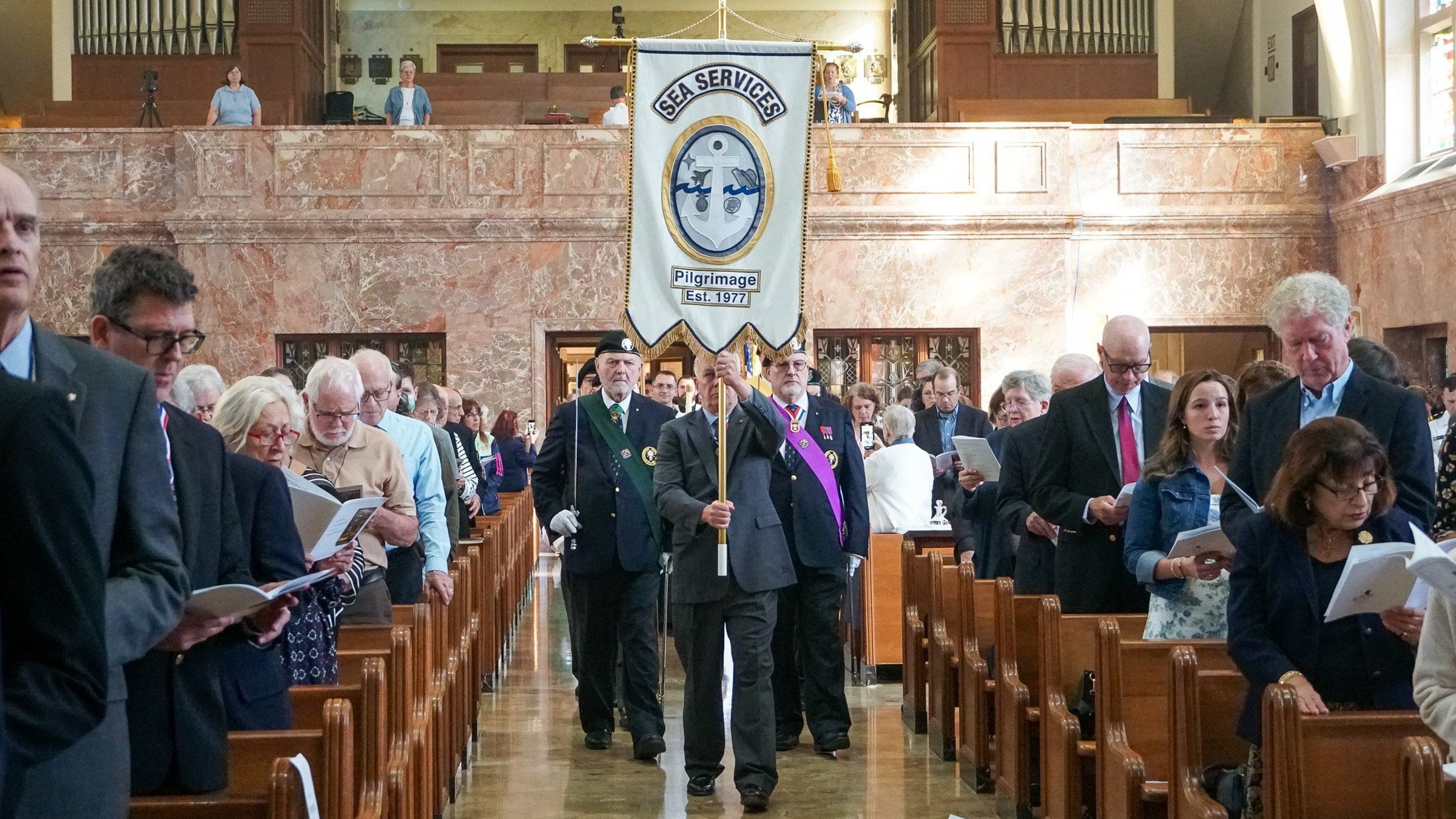 Before the final blessing, the congregation sang the Navy hymn, "Eternal Father, Strong to Save," with an additional verse: