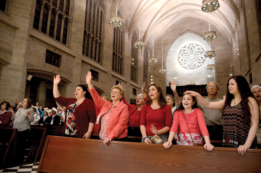 Members of the Charismatic Renewal pray with arms raised during a vigil Mass for Pentecost at the Cathedral of the Most Blessed Sacrament in Detroit in 2015. Next month, the local charismatic community will celebrate its 50th anniversary with a conference in Ypsilanti. (Joe Kohn | Archdiocese of Detroit)Local charismatic community prepares to celebrate 50th anniversary with conference in Ypsilanti