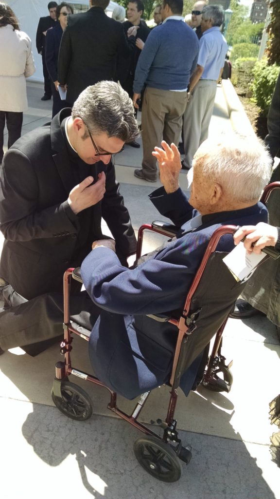 Msgr. Thomas Villerot blesses newly ordained Fr. Brian Meldrum in May 2015 at the Cathedral of the Most Blessed Sacrament in Detroit. Msgr. Villerot, at age 99 the oldest priest of the Archdiocese of Detroit, loved being a priest and attending archdiocesan functions well into his retirement years, friends said. Msgr. Villerot died Dec. 5. (Photo courtesy of Deacon Mike Stewart)“He was the type of priest who did whatever he was asked to do,” Fr. Babcock said. “When he was active, he tried to put the people first. When preaching, a child would cry or be fussy, and he stopped and thanked the mother for bringing the child to church. He firmly believed that children should be in church.”
