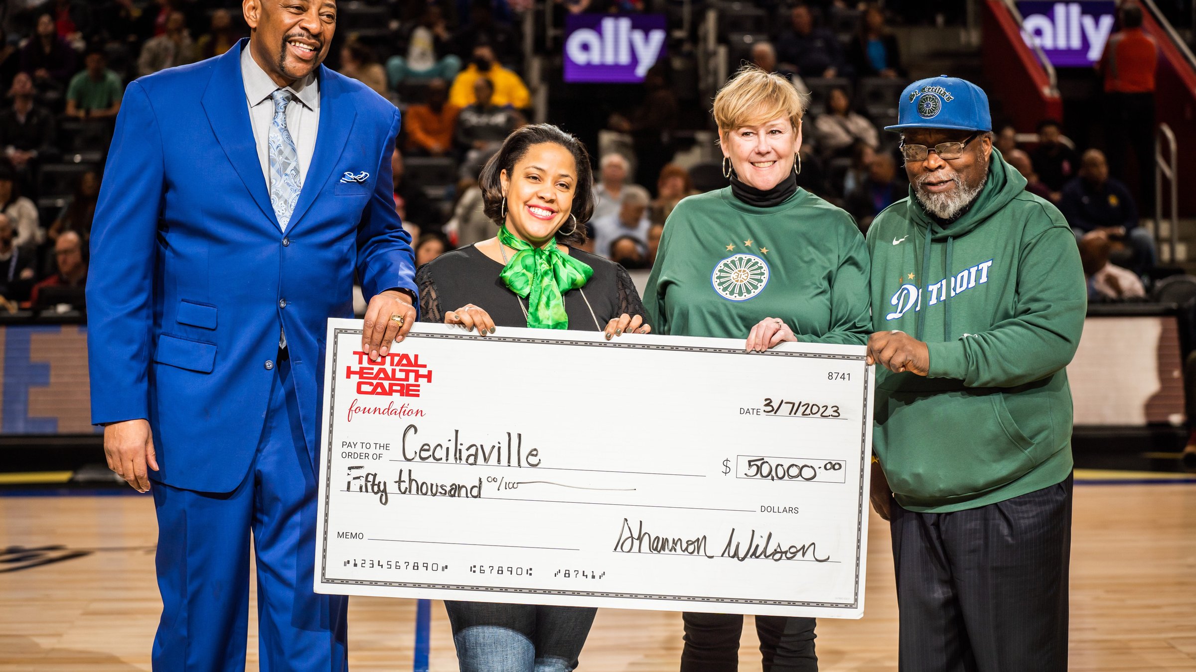 During Tuesday night's game, Ceciliaville's board of directors was presented a $50,000 check from the Total Health Foundation, the philanthropic arm of Priority Health, a corporate sponsor of the Pistons. The check was presented during the second quarter of the Pistons’ 119-117 defeat to the Wizards, with the Pistons wearing their special green City Edition “313” uniforms in honor of Ceciliaville.