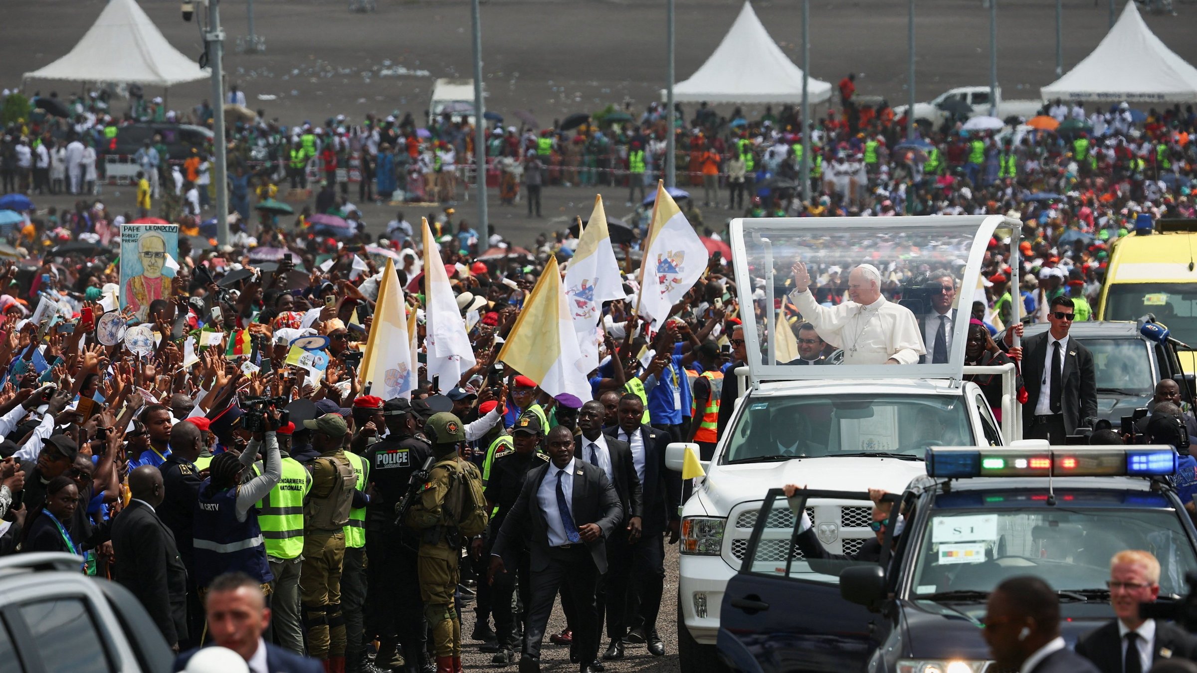 The pope flew 160 miles from Yaoundé to Douala on Friday morning for the Mass, at which he greeted the enthusiastic crowd from the popemobile.
