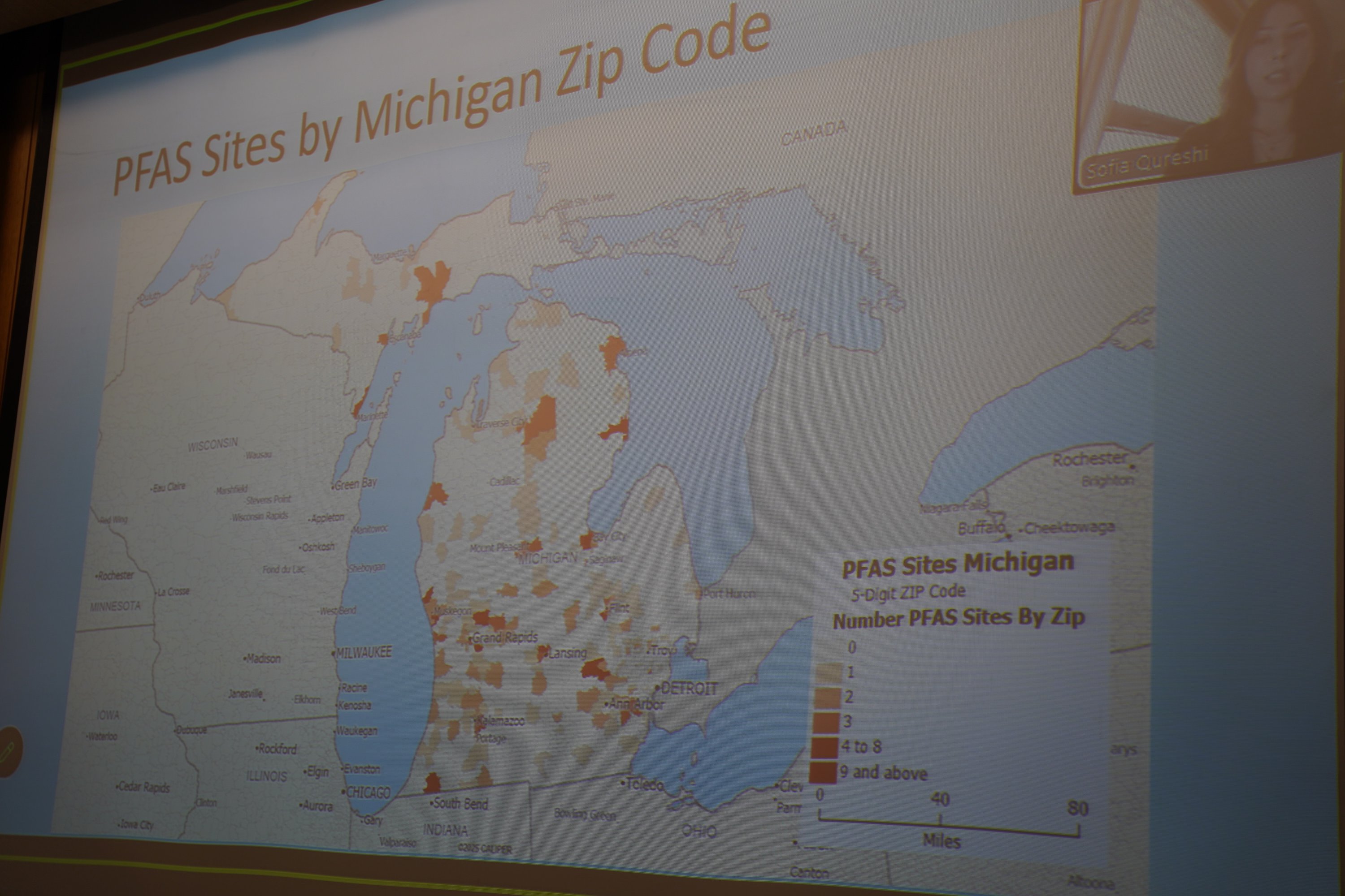 Qureshi focused her portion of the presentation on PFAS — commonly referred to as “forever chemicals” — and the long-term impact of exposure to these chemicals across Michigan ZIP codes and income levels.