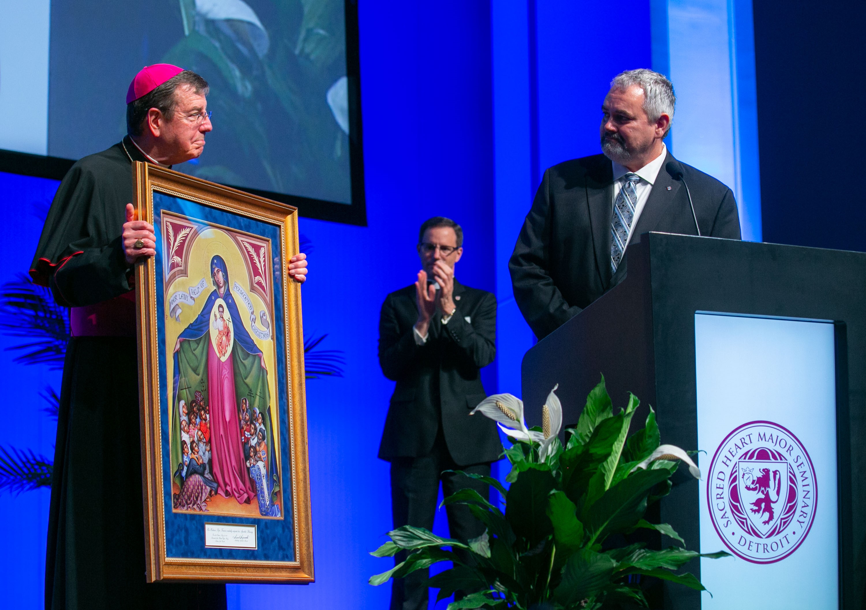 After accepting the gift, Archbishop Vigneron took to the podium, where Chassé had another gift for the archbishop – a large icon of Our Lady Help of Christians, a devotion near and dear to the Knights of Columbus.