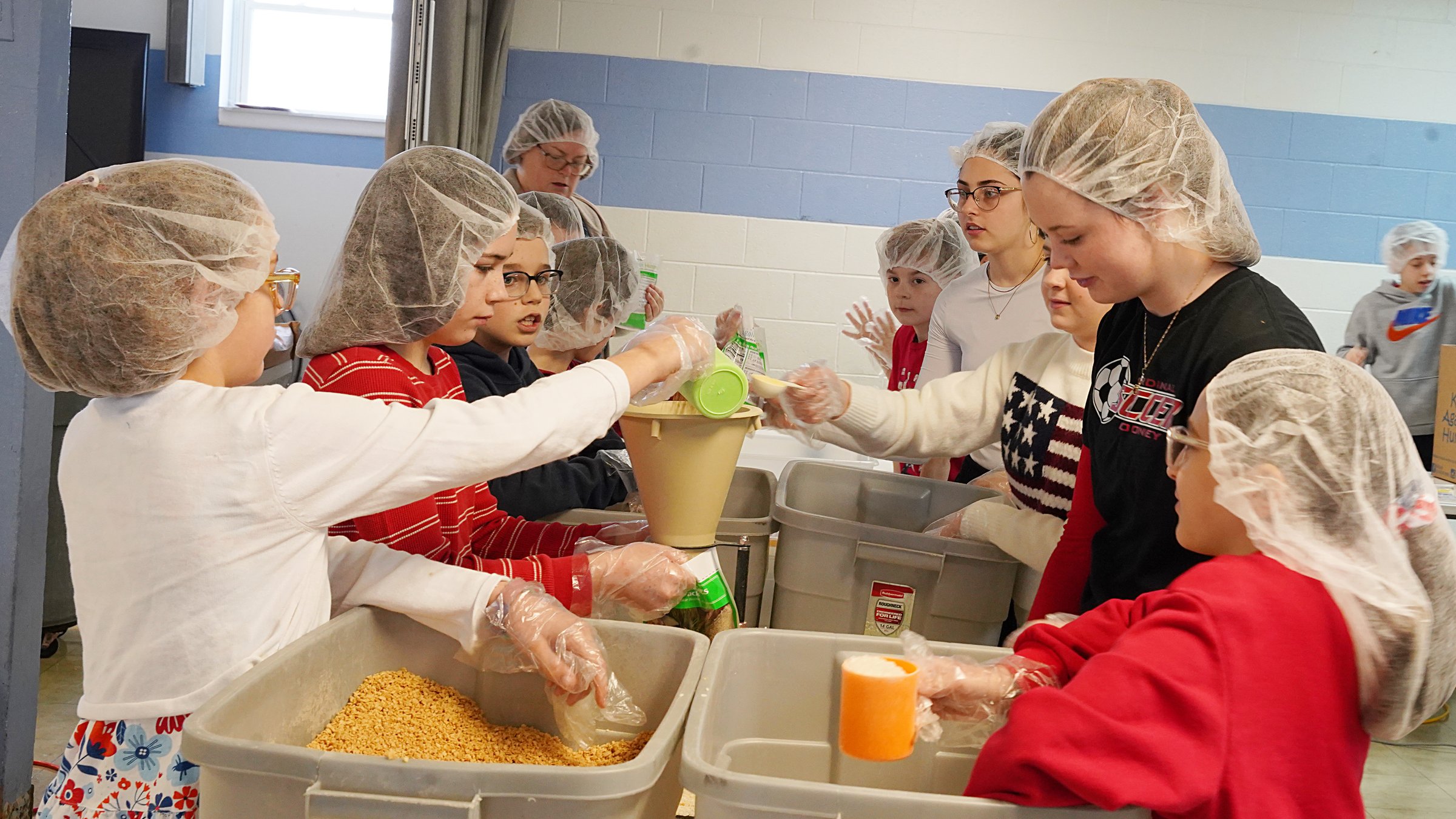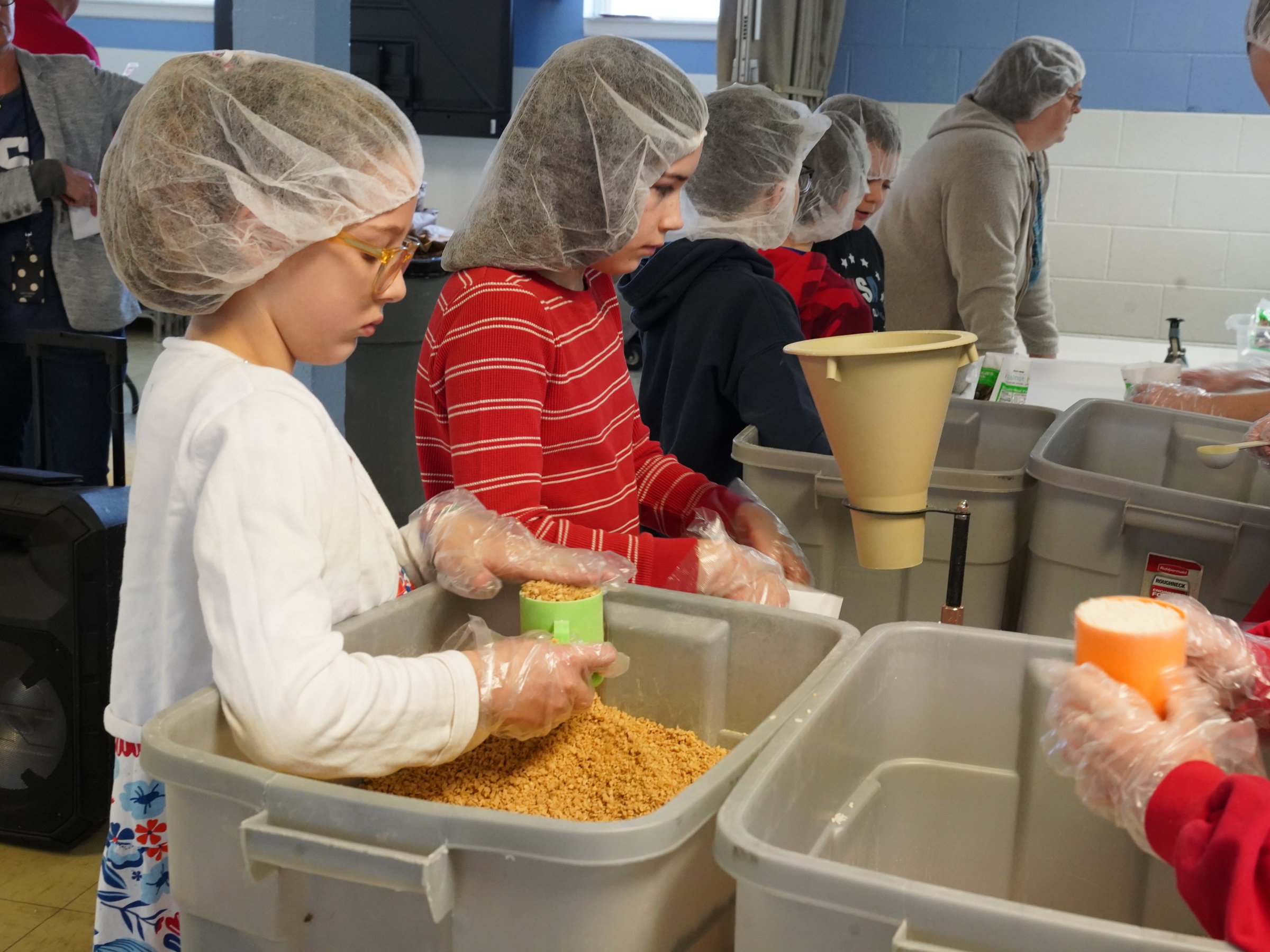 After a quick prayer, blessing the food and all who will receive it, students from all grades worked side by side, pouring portions of rice, soy, vegetables and chicken-flavored vitamins into sealed bags that were packed away into boxes for shipping.