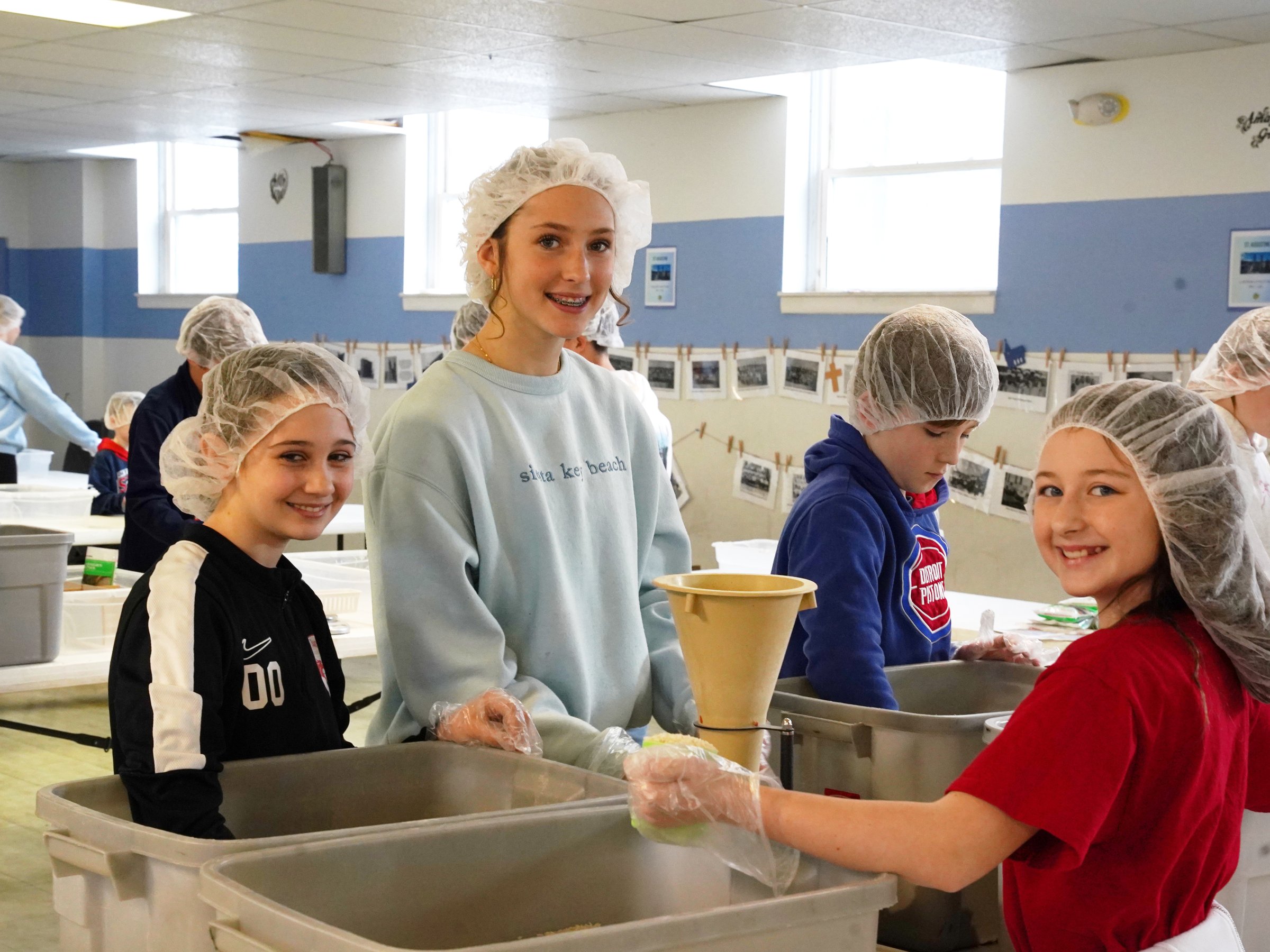 Students at the K-8 school, along with St. Augustine alumni who are attending Cardinal Mooney High School in Marine City and Austin Catholic High School in Chesterfield Township, worked at tables in the school basement, filling, sealing and stacking bags of dry food for distribution.