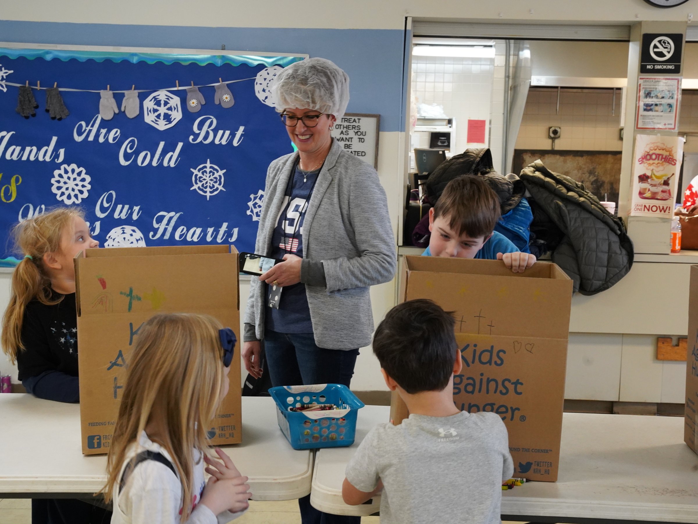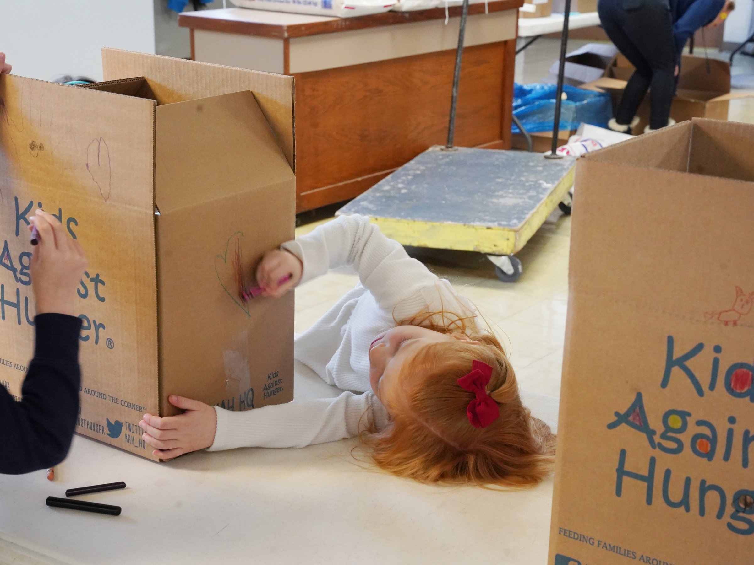The older students taught the younger students, while the preschoolers decorated the boxes with crayons.