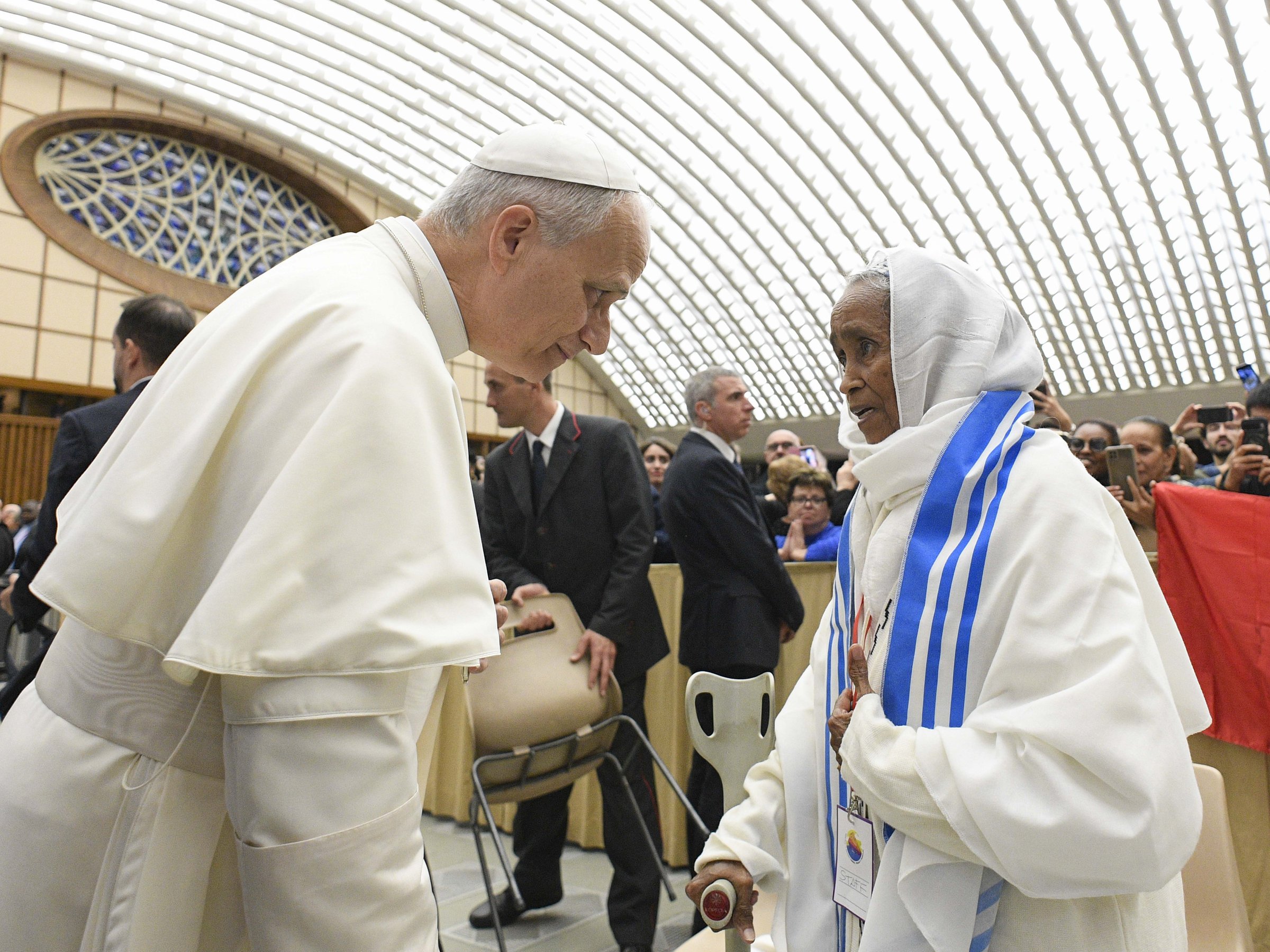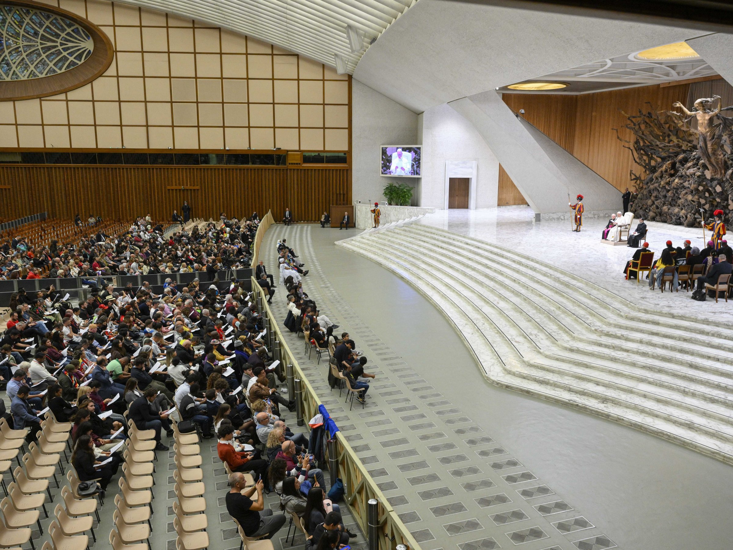 The gathering in the Paul VI Audience Hall was part of the Jubilee of Popular Movements and the Fifth World Meeting of Popular Movements taking place in Rome Oct. 21-24. The popular movements include those that organize informal workers who collect and recycle trash, gather people who live in the informal settlements on the outskirts of cities, rally citizens to promote care of the environment, assist subsistence farmers and rescue migrants at sea.
