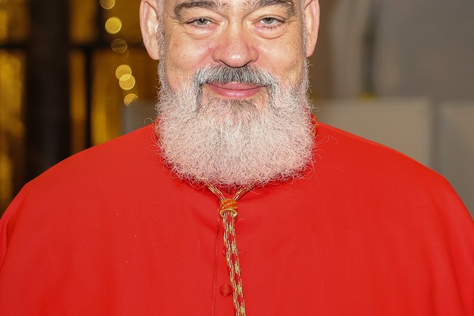 He carefully held on to his gifts, a large Hershey's Kiss chocolate and an Our Lady of the Miraculous Medal prayer card. Rodthalia, in pink, held a pink-rose bouquet, and Michael, also in red, carried a rosary.