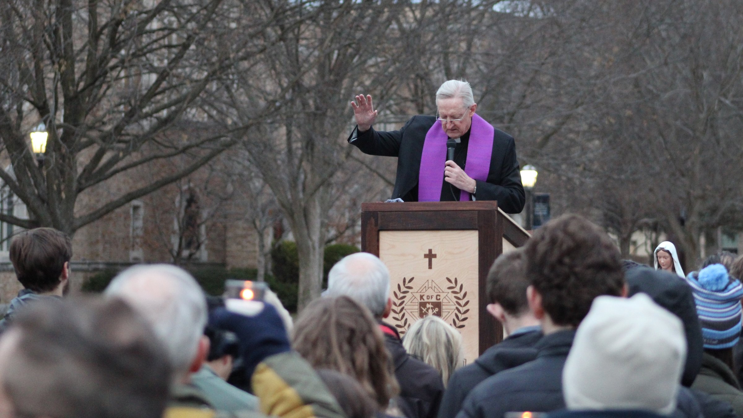 Holy Cross Father Wilson Miscamble, a retired history professor at Notre Dame and a very outspoken critic of the recent Ostermann appointment, then led a blessing of vigil candles being distributed throughout the crowd. But his prayer was also a prayer of intercession for the university with a very clear message.