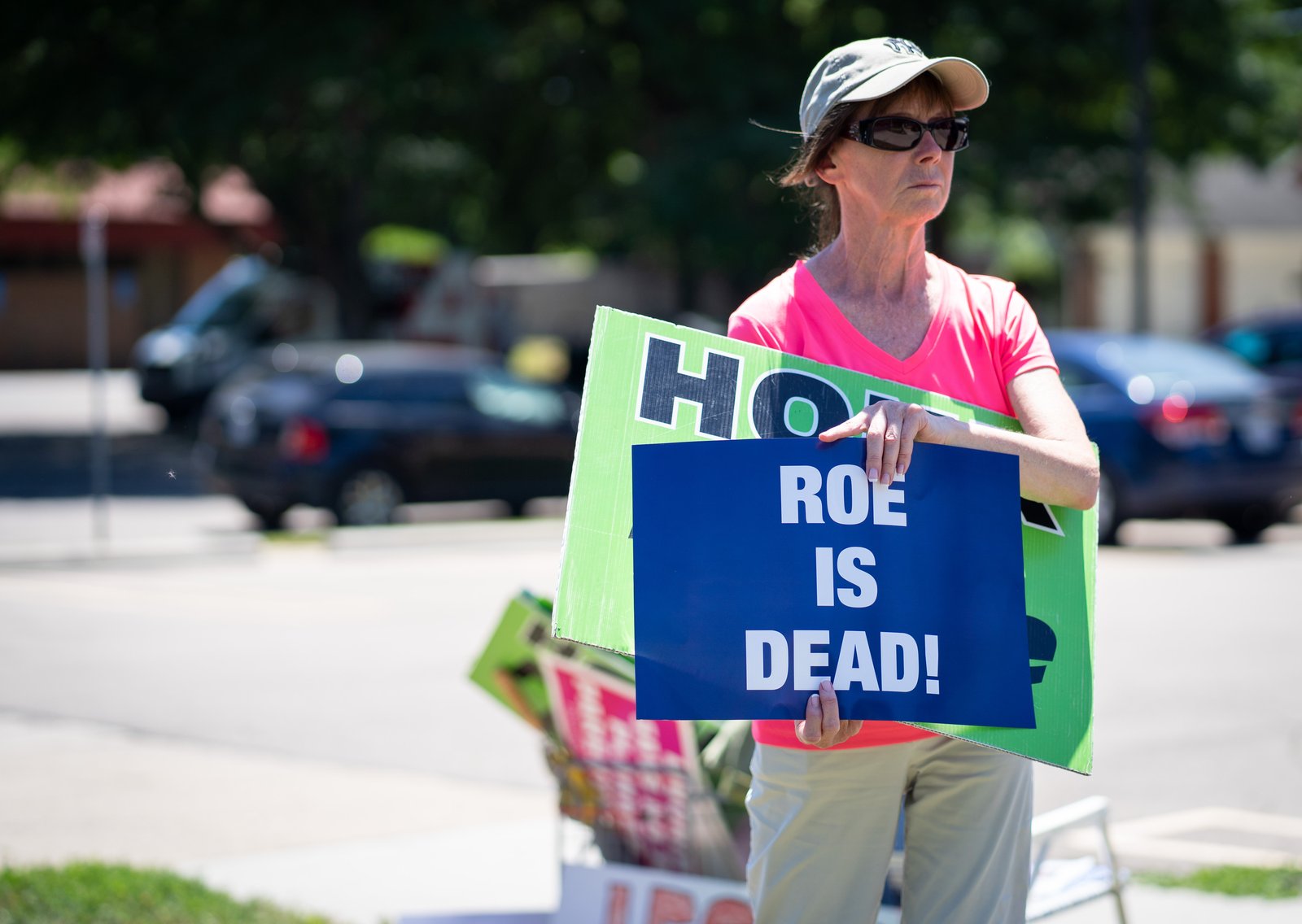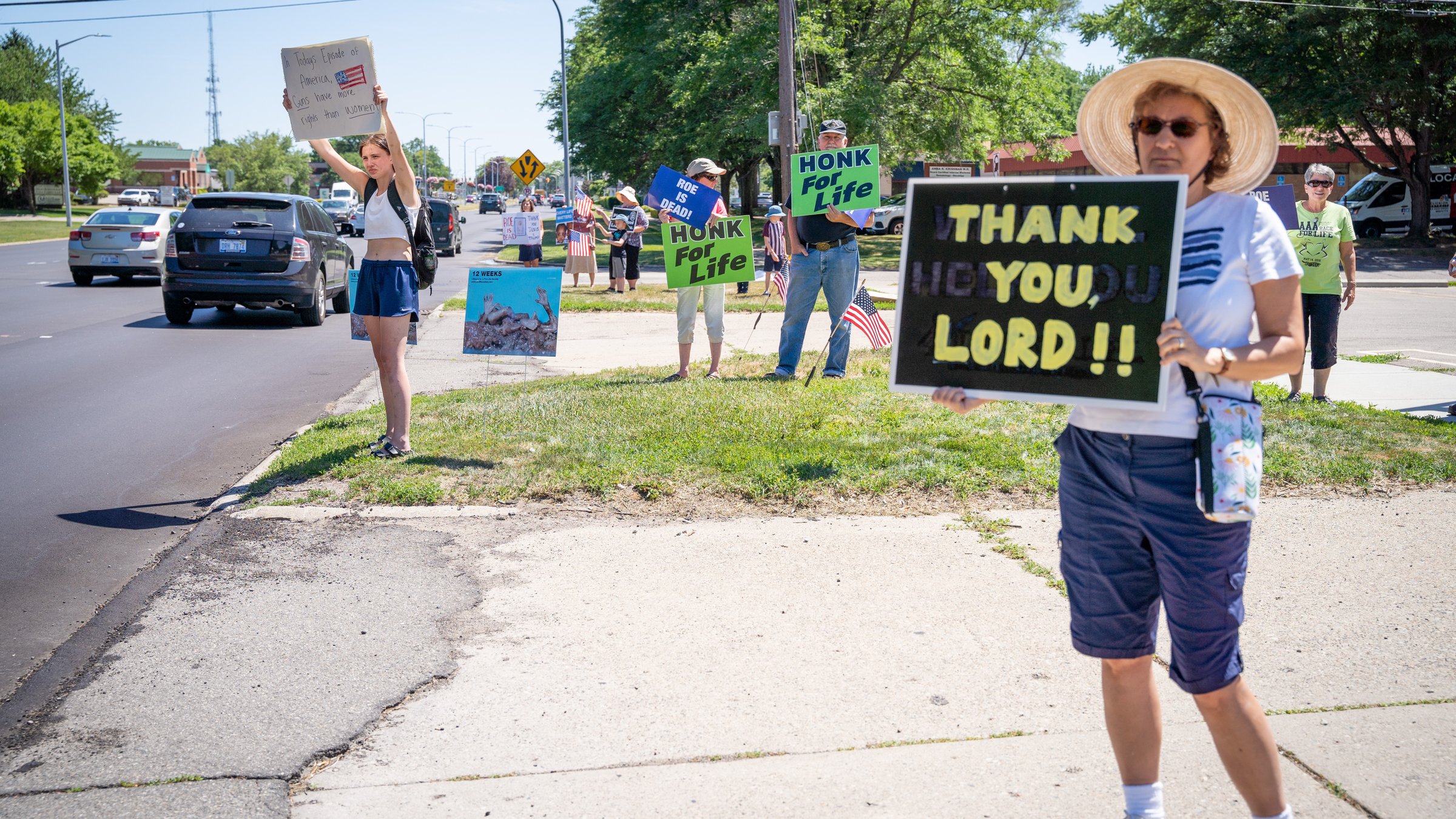 The rally, which was organized by Citizens for a Pro-Life Society, came just hours after the Supreme Court's decision and was one of many held across the state. As cars passed, many honked as the rally-goers held signs reading "Thank you, Lord" and "Roe is dead."