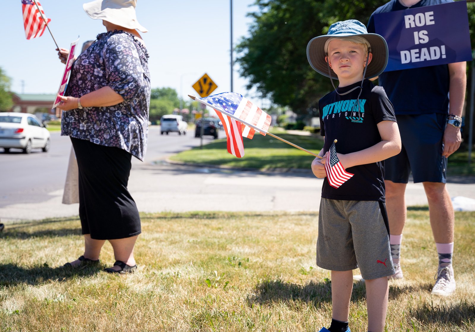 The Wilson family holds signs and American flags along Farmington Road in Livonia on June 24, hours after the Supreme Court's decision striking down Roe v. Wade.