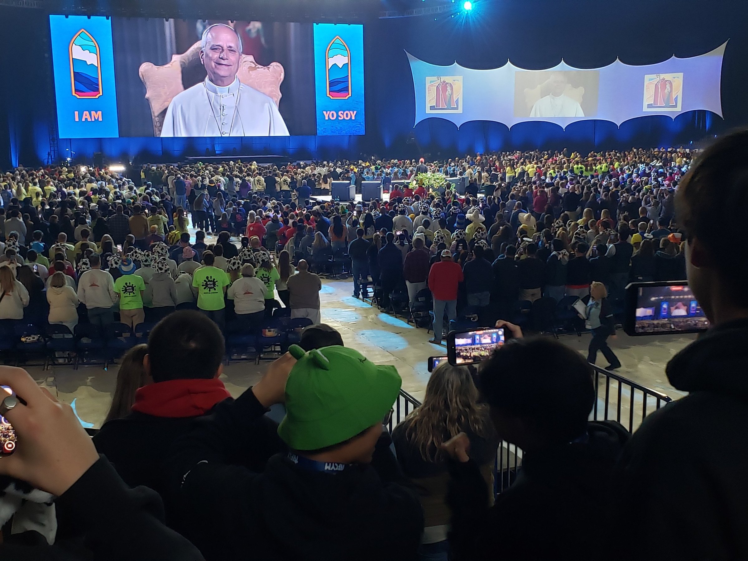 Katie Prejean McGrady, host of the "Katie McGrady Show" on SiriusXM's The Catholic Channel, moderated the discussion at Lucas Oil Stadium in which Pope Leo fielded questions from five high school students: Mia Smothers from the Archdiocese of Baltimore; Ezequiel Ponce from the Archdiocese of Los Angeles; Christopher Pantelakis from the Archdiocese of Las Vegas; Micah Alcisto from the Diocese of Honolulu; and Elise Wing from the Archdiocese of Dubuque, Iowa.