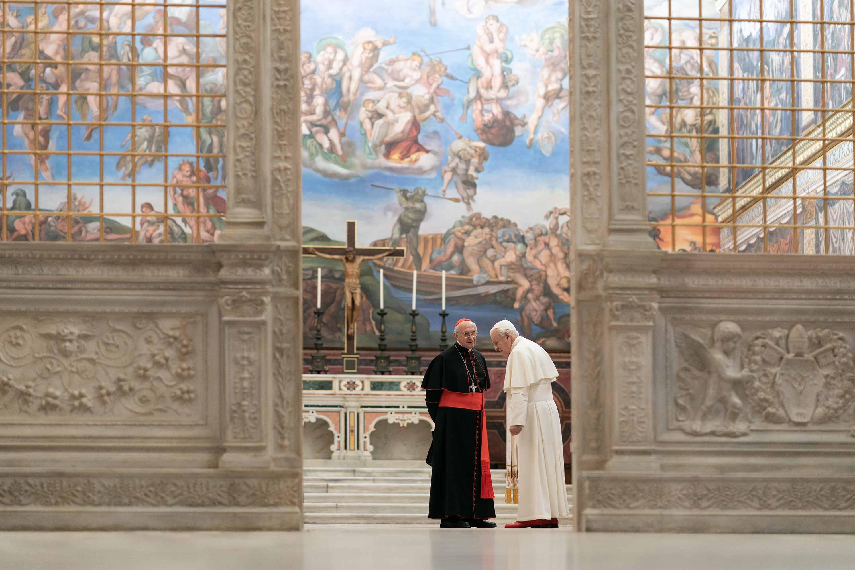 We see the two men pontificate (pun intended), debate, soften and ultimately become unlikely allies, all set against some great backdrops (Castel Gandolfo, the Sistine Chapel, even the courtyard in front of the Apostolic Palace where Bergoglio dances the tango with Benedict in front of the bemused papal staff).